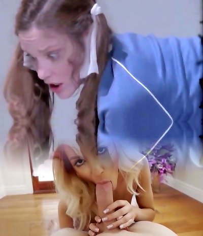 Nerdy redhead gal sucks and rides a manhood in the living room